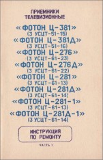 Приемники телевизионные Фотон. Инструкция по ремонту — Настоящая инструкция по ремонту предназначена для специалистов ремонтных предприятий, осуществляющих обслуживание и ремонт телевизионных приемников «Фотон Ц-276» (ЗУСЦТ-61-23), «Фотон Ц-276Д» (ЗУСЦТ-61-22) «Фотон Ц-381» (ЗУСЦТ-51-15), «Фотон Ц-381Д» (ЗУСЦТ-51-16) «Фотон Ц-286 (ЗУСЦТ-6МЗ), «Фотон Ц-281Д» (ЗУСЦТ-61-14) «Фотон Ц-281-Ь (ЗУСЦТ-61-13), «Фотон Ц-281Д-Ь (ЗУСЦТ-61-14). Прежде, чем приступить к ремонту телевизора, специалист ре монтного предприятия (в дальнейшем — «специалист») должен внимательно изучить настоящую инструкцию. В инструкции приведены: принцип работы и описание элек> трической схемы телевизора, отдельных каскадов и модулей, даны рекомендации по организации рабочего места, по обнаружению и устранению возможных неисправностей, необходимые справочные материалы. Название: Приемники телевизионные Фотон. Инструкция по ремонту Издательство: Симферополь. Таврида Год: 1988 Страниц: 74+196+100 Формат: DJVU, PDF Размер: 22,3 МБ Качество: отличное