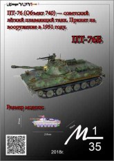 KesyaVOV. Лёгкий танк ПТ-76Б — Бумажно-картонная модель-копия советского лёгкого плавающего танка времён «холодной войны». ПТ-76 (Объект 740) принят на вооружение в 1951 году. За время серийного производства, с 1951 по 1967 год, неоднократно модернизировался, всего было выпущено 3039 ПТ-76, а также ряд машин на его базе. Танк состоял на вооружении Советской Армии, однако впоследствии был в основном заменён БМП. Тем не менее, до 100 танков этого типа по состоянию на 2004 год состояло на вооружении вооружённых сил России. Около 2000 ПТ-76 были поставлены на экспорт, в ряд стран, в некоторых из которых он послужил основой для выпуска собственных модернизированных версий. По состоянию на начало 2008 года, всё ещё остаётся на вооружении в ряде стран. Масштаб: 1:35, 1:50. Название: KesyaVOV. Лёгкий танк ПТ-76Б Издательство: KesyaVOV Страниц: 17 Формат: PDF Размер: 84,22 МБ Качество: отличное
